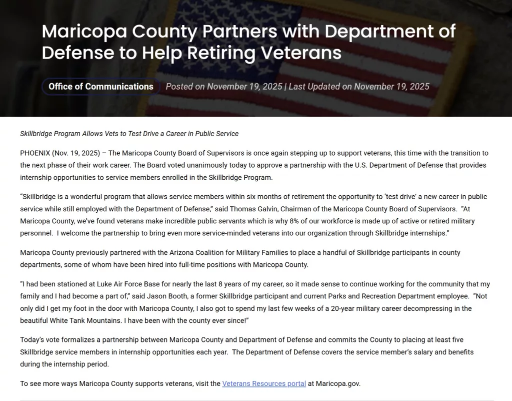 We are pleased to share that our team has already placed the next SkillBridge candidate, who will begin their on-the-job experience with Maricopa County as they prepare for their transition out of active duty. This continued momentum is exactly what we hoped to see when we began building this partnership.